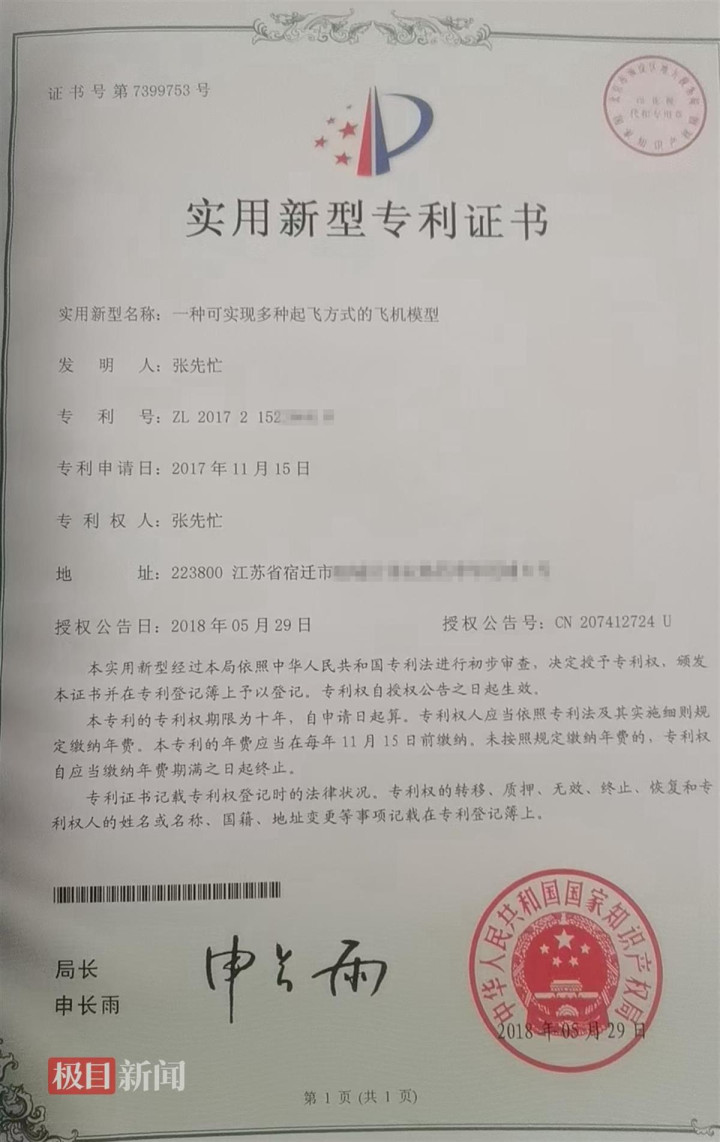 张先忙提供给记者的专利证书显示,他已经获批的与航模相关的专利有20多个,包括多个实用新型专利和外观专利。